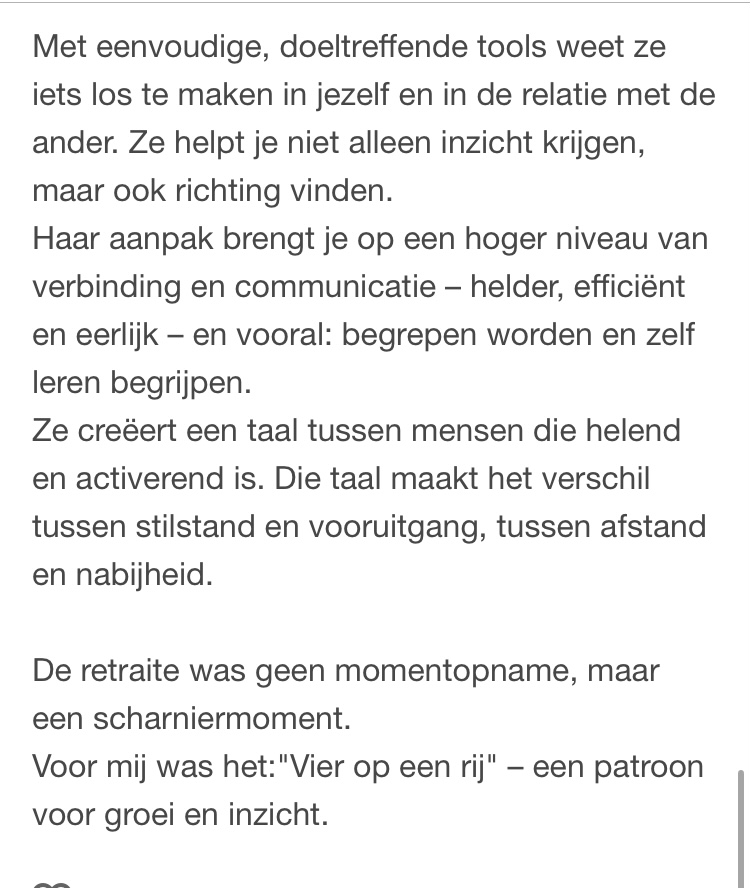 Het werken met paarden is heel verhelderend. Op korte tijd krijg je inzicht in de dynamiek tussen jou en je kind. Dankzij Joke voel je je veilig en krijg je uitleg in mensentaal van wat zij ziet gebeuren tussen jou en je kind. Een aanrader!